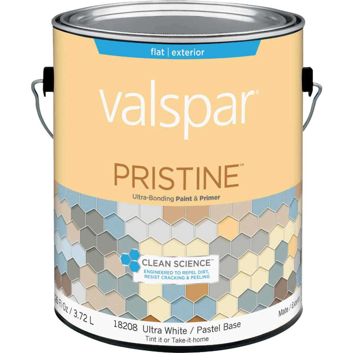 Flat exterior house paint. Valspar Pristine Exterior with Clean Science Technology is a whole new standard of clean – outdoors. With tightly woven cross linking molecules, Pristine exterior delivers steely smoothness that actually denies entry to dirt and stain molecules. Optimized for extreme adhesion and flexibility using elastomeric polymerization, Pristine delivers extreme flexibility to ward off cracking and peeling. Pristine Exterior is a proven fighter of algae and other organic growths. Prinsine Exterior is an ultra-bonding Paint & Primer with a lifetime warranty. It is available in 3 exterior sheens and 3 tinting bases. 100% acrylic. For use on: Properly prepared exterior wood, metal siding and trim including hardboard, fiber cement, vinyl, primed metal, shakes, brick, cement, cinder block, and stucco.